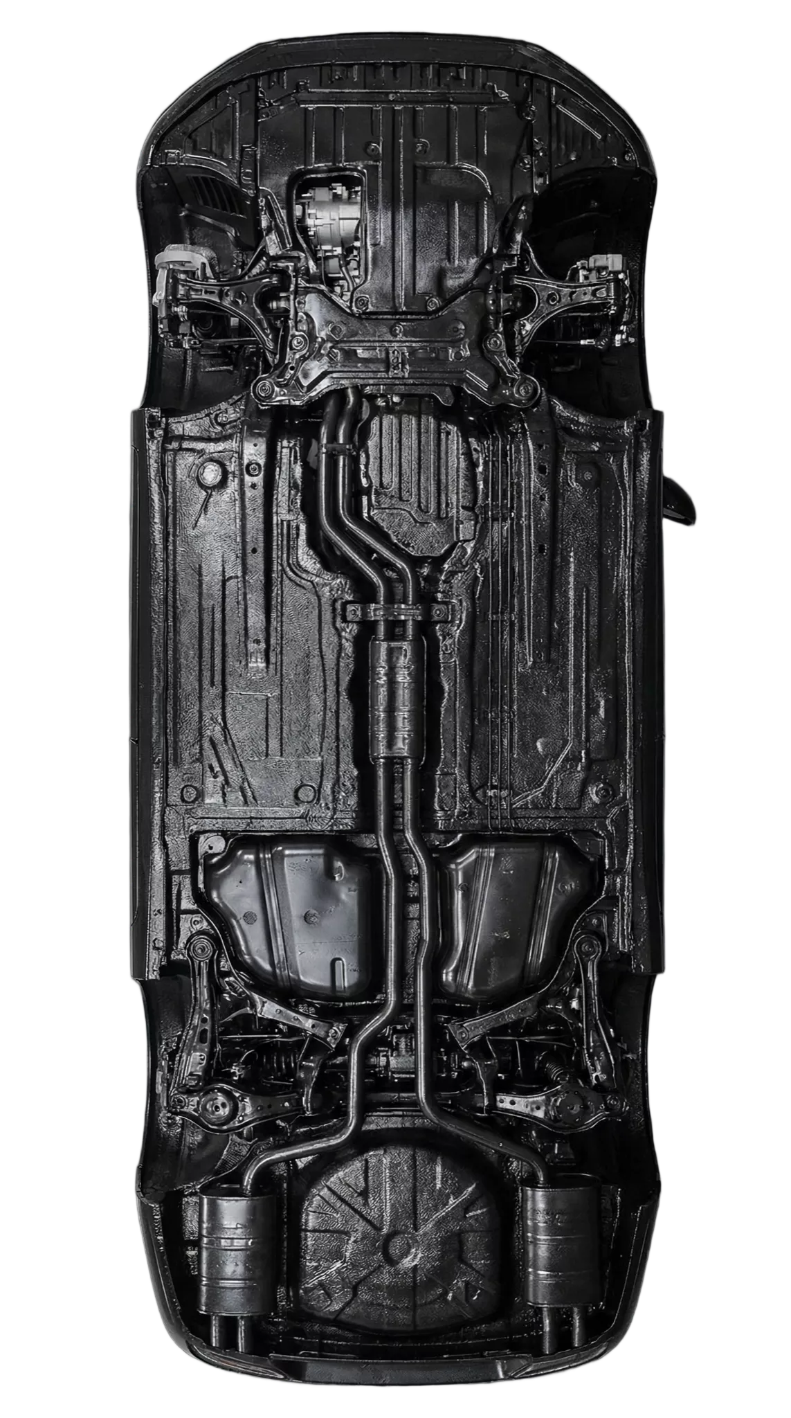 Для выполнения задачи был применён премиум-комплекс «Diamond». После тщательной мойки и подготовки на все поверхности днища, рамы, арок и, что критически важно, во внутренние полости и сварные швы были нанесены специализированные составы. Проникающий препарат защитил металл изнутри, а эластичная резиновая мастика создала непроницаемый внешний барьер против воды, грязи, камней и химических реагентов.